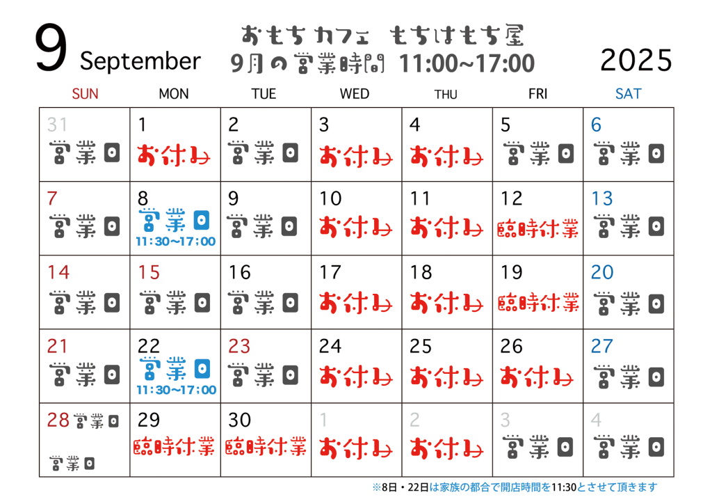 都合により2025年9月29日(月)30日(火)は臨時休業させていただきます。